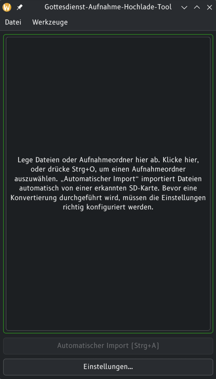 Beim Start von GDAHT öffnet sich ein Fenster, in dem du direkt Aufnahmedateien ablegen kannst. Alternativ kannst du auch auf die Ablagefläche klicken oder Strg+O drücken, um eine Ordnerauswahl zu öffnen.