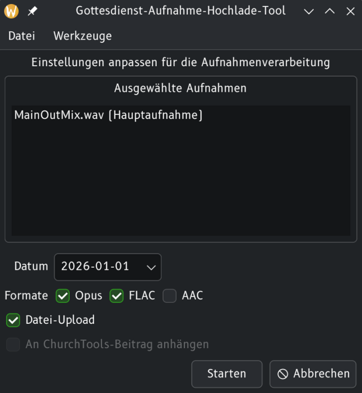 Das Datum wird automatisch aus dem Ordnernamen ermittelt, kann aber auch manuell verändert werden. Die zu erstellenden Audioformate sind änderbar, wobei mindestens ein Format ausgewählt sein muss.