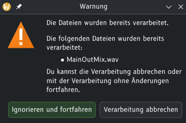 - Ignorieren der Warnung. Dann werden alle Dateien, so wie du sie ausgewählt hast, regulär verarbeitet.